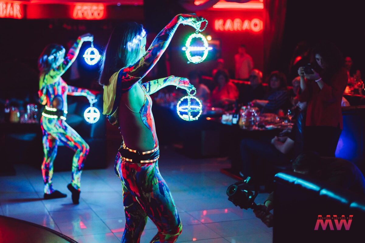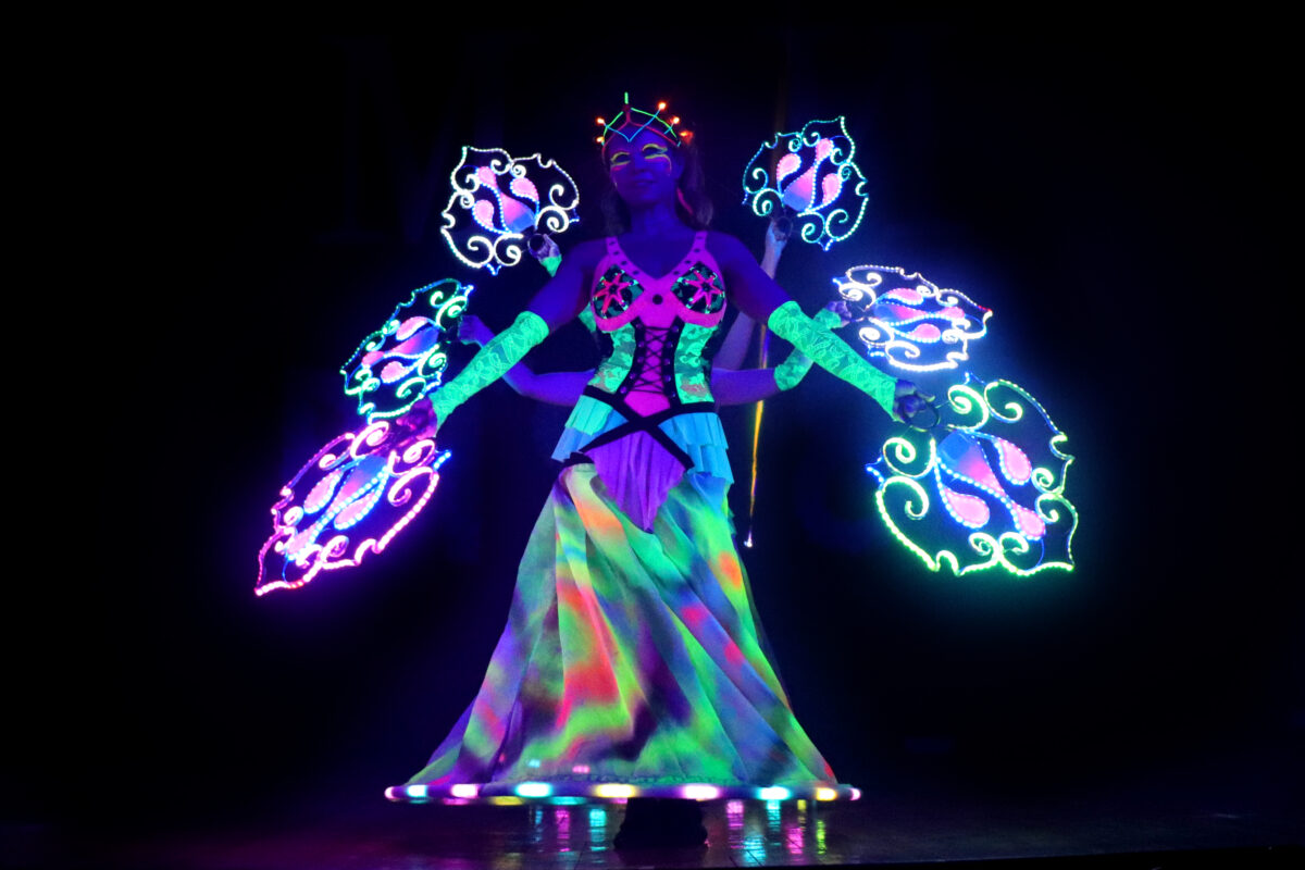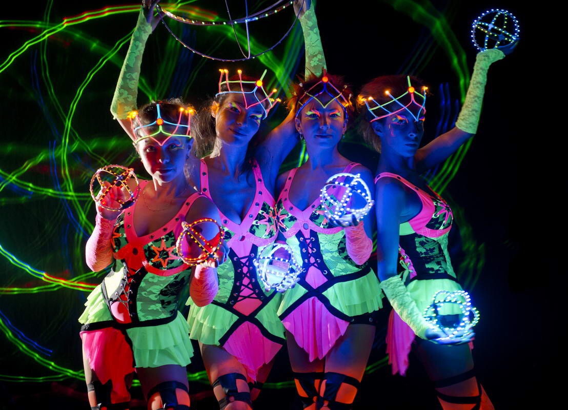 Во время шоу вы увидите танцы со светом: «Лазер Леди и Крылья», «Даббл Стафф», Цветочные Веера, Кометы и Сферы, Обруч, Ленты, пиксельпои.
